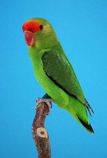 Abyssinian lovebirds are sexually dimorphic. Basically a green bird the cock’s forehead, it’s lores and a small ring of feathers around the eye are bright red. The under wing covert are black. The hen lacks these red and black areas. Both sexes have a red bill however. With a length of 16.5 cm the Abyssinian is the largest species of the lovebird tribe.